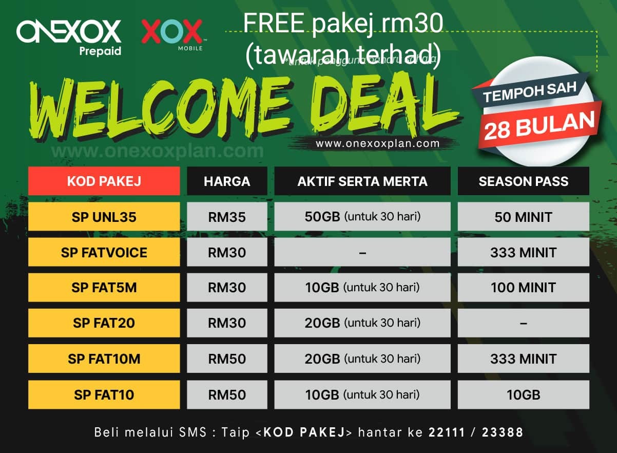 ONEXOX Postpaid 100Gb 44Gb Prepaid 28Month Welcome Deal Starter New Number Or Mnp Port In Xox Random Free Gift. Anda akan ditawarkan ke Group Telegram XpresiXOX Group ini bagi memudahkan sokonganbantuan pertanyaan tawaran diskaun atau hadiah untuk masa. 3 Beli simkad SRP pada harga RM10 sahaja.